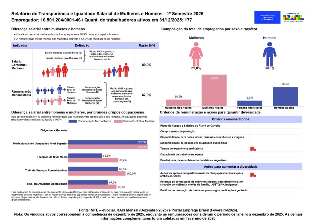 Em compromisso com a transparência e em conformidade com as diretrizes do Ministério do Trabalho e Emprego, divulgamos os dados referentes ao 1º Semestre de 2026. O relatório detalha a composição do nosso quadro de colaboradores e as métricas de remuneração entre homens e mulheres.